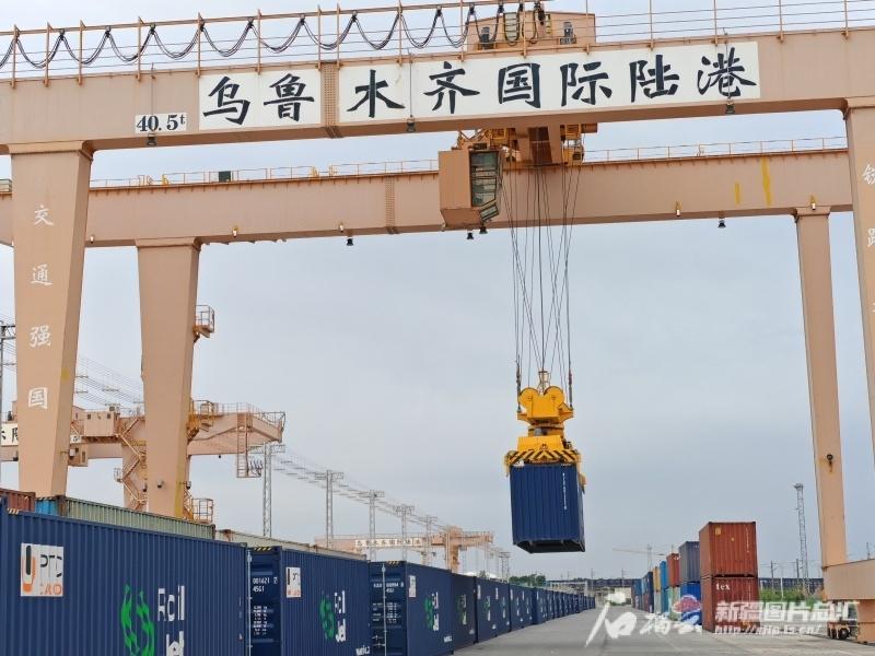 7月1日,乌鲁木齐国际陆港区中欧班列(乌鲁木齐)集结中心内,龙门塔吊在吊装集装箱。石榴云/新疆日报记者 逯风暴摄