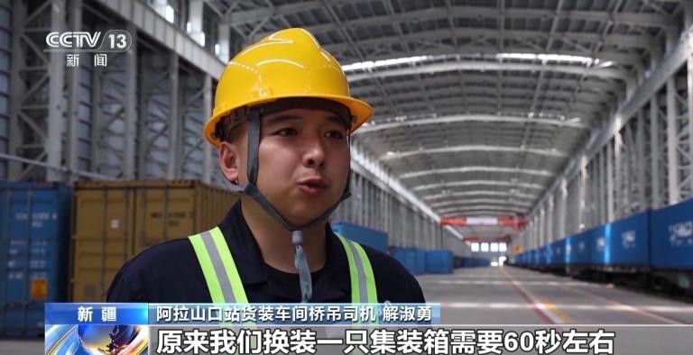 阿拉山口站货装车间桥吊司机 解淑勇:原来我们换装一只集装箱需要60秒左右,现在仅需40秒。一趟编组55辆,如果按照一辆车装两只集装箱,一列车节省了约40分钟,加上其他作业环节,以前需要2小时10分左右才能完成整趟班列的换装作业,现在只需要一个半小时,班列通行效率大幅度提升。