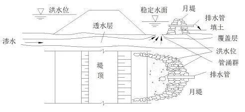 沙基:地层结构上一层为粘性土,一般小于2米,其下为透水性较强的粉细砂、中细砂、砂砾石层。当外河外湖水位过高,水将通过沙基向堤面内部渗透,主要有分散性渗漏和集中渗漏两种形式。洪水期集中渗漏较普遍,初期以流土为主,最终形成管涌,管涌将带走沿途土质颗粒,当空洞到一定程度后,可能造成堤防塌陷,进而发生溃垸险情。