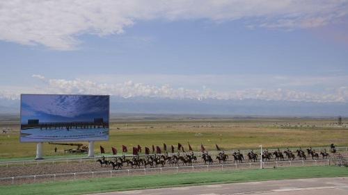 天空一望无际,远处雪山连绵,近景绿意盎然。开赛仪式上,3500余匹骏马组成的马队方阵十分壮观。在赛场附近的草原上,骏马在人们周围来回跑跳,记者遇到了一位参加开幕式演出的哈萨克族少年,他骑着一匹白色的马飞驰而来。