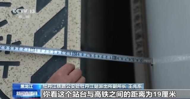 牡丹江铁路公安处牡丹江站派出所副所长 王兆东:车体与站台之间是存在一定缝隙的,最大可达20多厘米,这个站台与高铁之间的距离为19厘米,普速列车和站台之间的距离是23厘米。这个距离对于小朋友来讲是较为宽松且危险的,稍有不慎便会从缝隙中掉下去。铁路部门与我们铁路公安机关在站台上24小时不间断地进行安全宣讲及音频提示,但是仍有些家长没有注意。