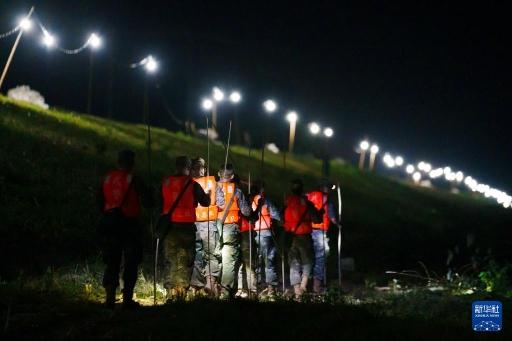7月8日,南部战区空军航空兵某师官兵在湖南省岳阳市华容县团洲垸钱团间堤巡堤排险。新华社发(张延霞 摄)