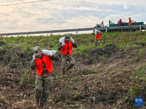 7月8日,南部战区空军航空兵某师官兵在湖南省岳阳市华容县团洲垸钱团间堤搬运沙袋封堵渗水点。新华社发(向博文 摄)