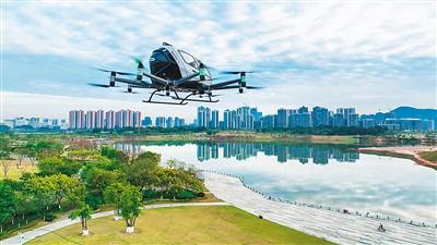 图为亿航无人驾驶载人航空器在广州九龙湖上空飞行。李剑锋摄