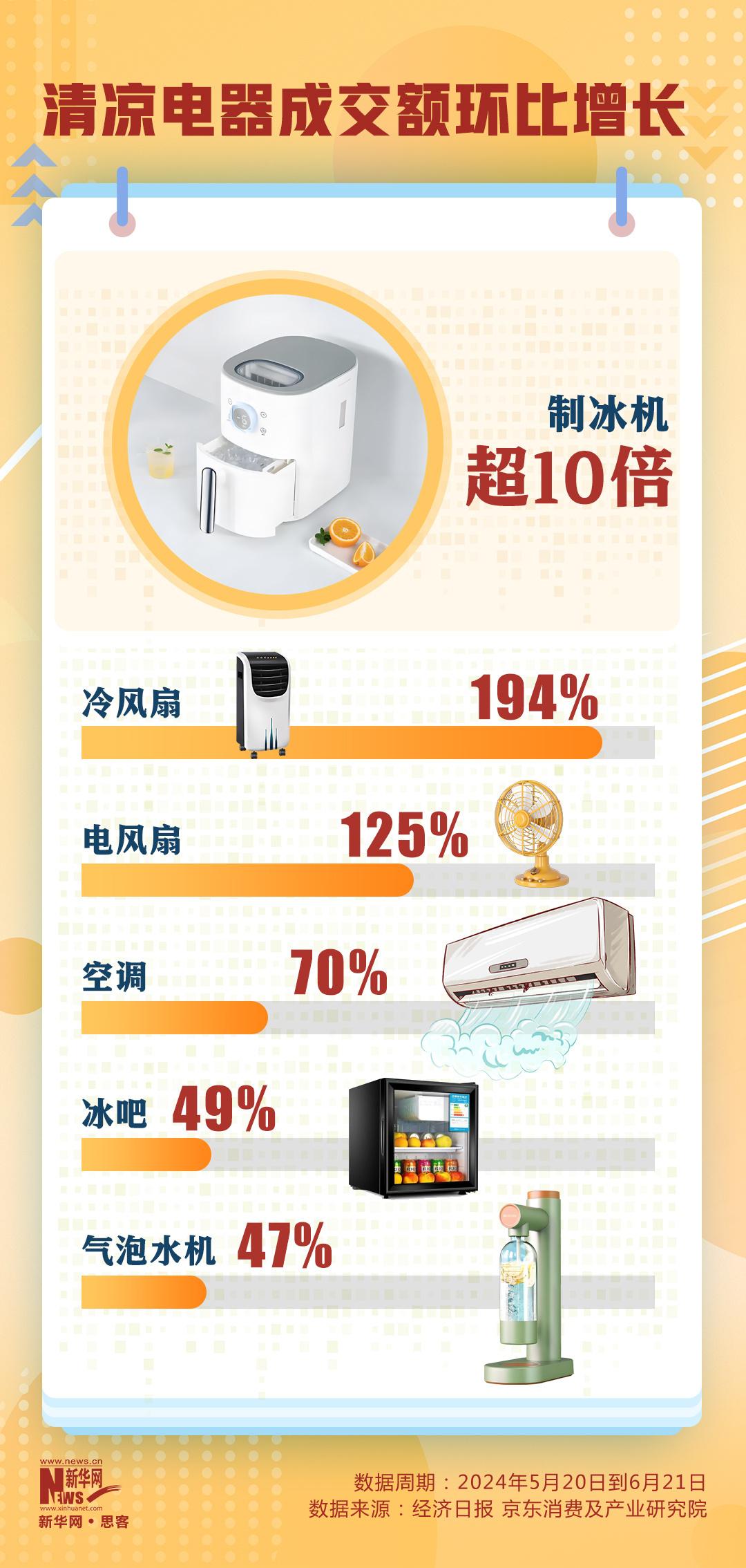 经济日报和京东消费及产业研究院联合发布的数据显示,在5月20日到6月21日时间段内,家用电器中的冷风扇、电风扇、空调、冰吧、气泡水机成交额增长显著,深受消费者青睐。在空调类产品中,无风感挂机空调是今年的一匹黑马,它不仅可以防止冷风直吹,还有高温除菌和手机智能控制等功能,兼顾科技感和体验感,受到消费者欢迎。今夏消费者在挑选消暑电器时,更注重“低耗能”“一级能效”等关键词,在享受清凉的同时不忘节能环保。