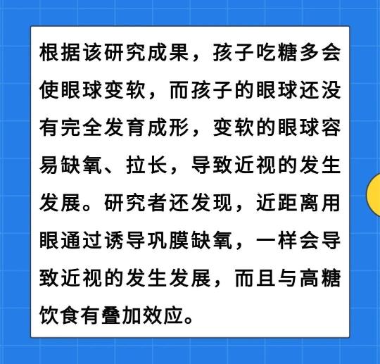所以,家长不仅要控制孩子吃糖的量,还要建议孩子餐后1小时内避免或尽量减少近距离用眼。否则,餐后胰岛素的飙升和近距离用眼导致的缺氧会给眼球带来双重打击。