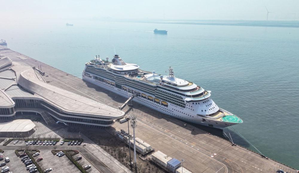 4月7日,“海洋旋律”号邮轮停靠在天津国际邮轮母港(无人机照片)。新华社记者 孙凡越 摄