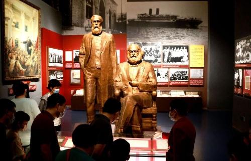 2022年7月3日,参观者在中国共产党历史展览馆内的马克思与恩格斯雕像前了解展出内容。新华社记者潘旭摄