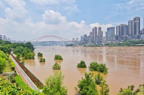 ▲7月12日,随着嘉陵江洪水过境,江北嘴江滩公园附近靠近江面的道路已经被淹没。记者 崔力 摄