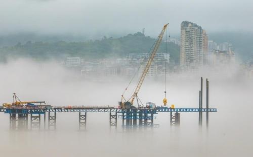 ▲7月12日,开州区汉丰湖,工人们正在修建滨湖栈道。通讯员 王晓宇 摄