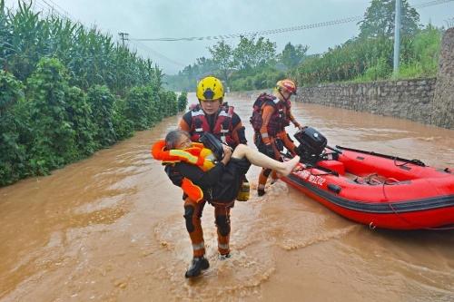 ▲7月11日,垫江县杠家镇资汇村,消防队员正在紧急转移被困群众。通讯员 魏瑞 摄