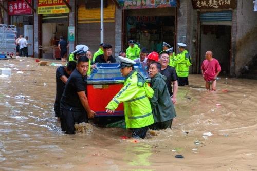 ▲7月11日,巫溪县宁河街道,工作人员在水中帮市民转移物资。巫溪县县委宣传部供图