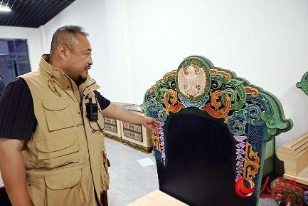 闻都苏向记者介绍蒙古族家具制作。人民网记者 刘艺琳摄