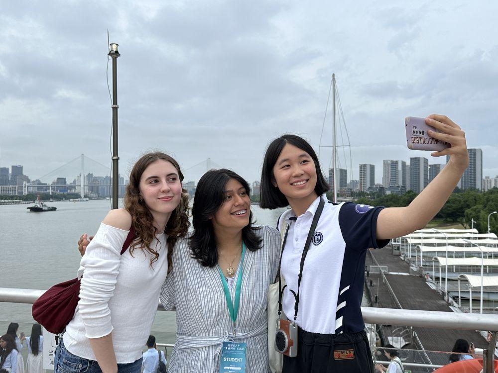 7月11日,中美两国学生在上海黄浦江游船甲板上合影留念。 新华社记者 袁睿 摄