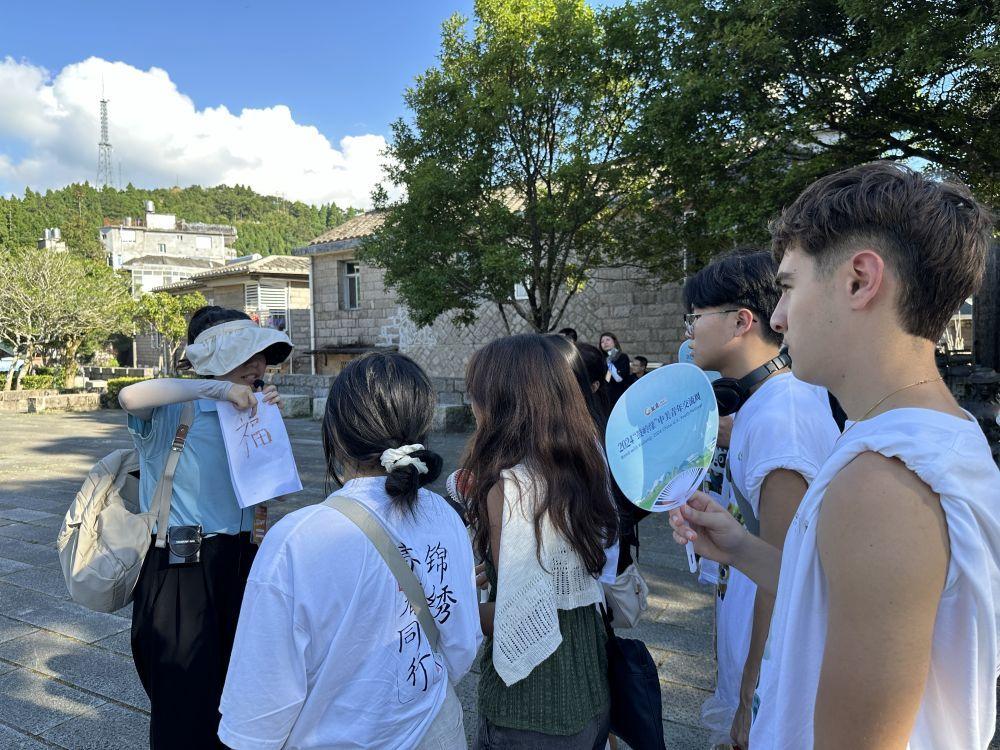 7月6日,美国青少年在福州鼓岭听导游讲解“福”字的含义。新华社记者 袁睿 摄