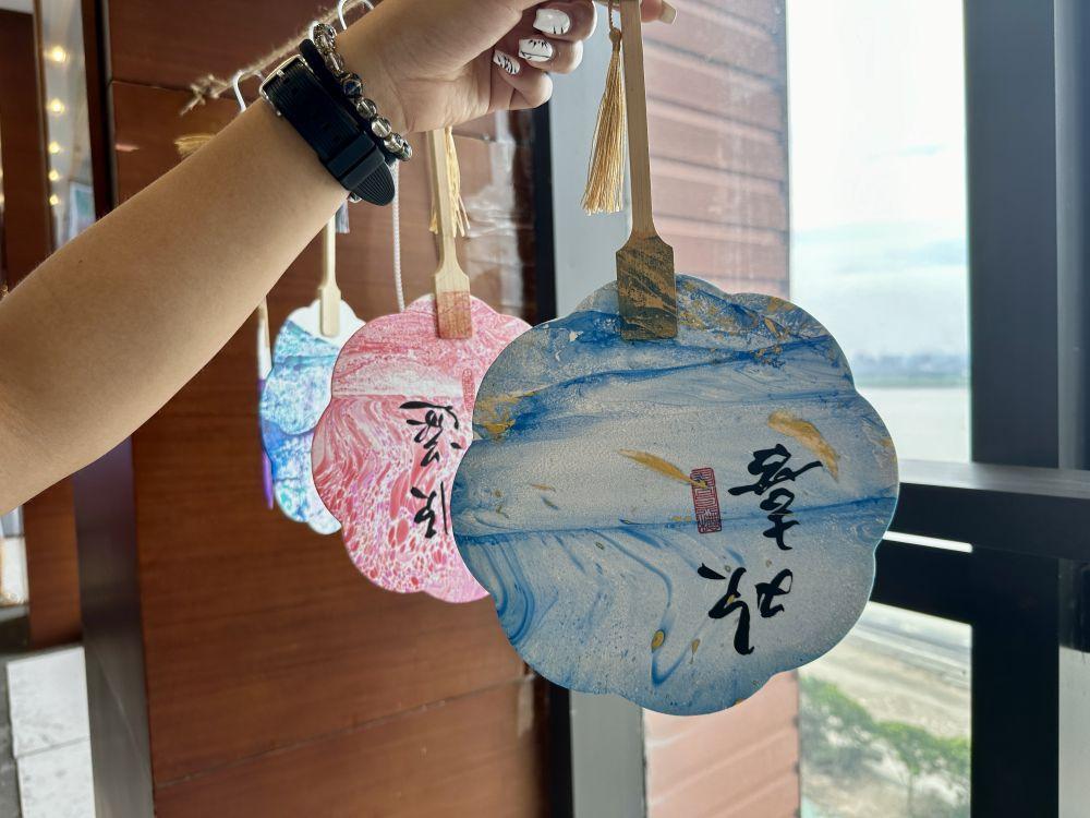 7月9日,美国青少年在浙江省杭州高级中学学生帮助下制作的漆扇正在晾干。新华社记者 袁睿 摄
