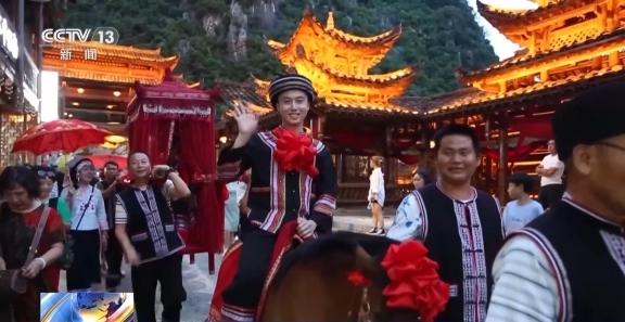 在地处黔西南州的峰林布依景区,游客只要预约,就可以体验一场布依族的特色婚礼,骑着马,坐着轿子,被担着鸡、挑着咸猪肉的送亲队伍簇拥着,游客们玩得不亦乐乎。
