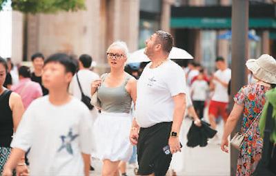 两名外国游客在上海南京东路步行街游览。翁奇羽 摄(人民视觉)