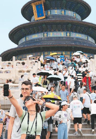 两名外国游客在北京天坛公园祈年殿前自拍合影。新华社记者 鞠焕宗 摄