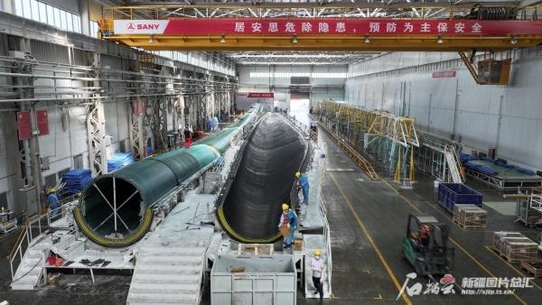 7月12日,在新疆塔城重点开发开放试验区先行发展区,三一(塔城)风电设备有限公司叶片生产现场。代姣美摄