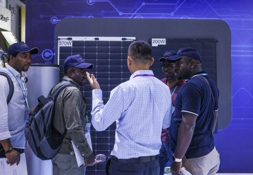 4月15日,参展商在第135届广交会上向采购商介绍太阳能电池组件展品。新华社记者 刘大伟 摄