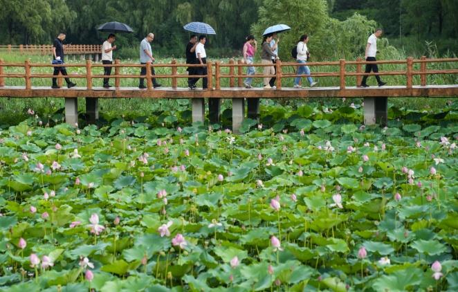 图为孝义孝河国家湿地公园雨中荷塘美景。