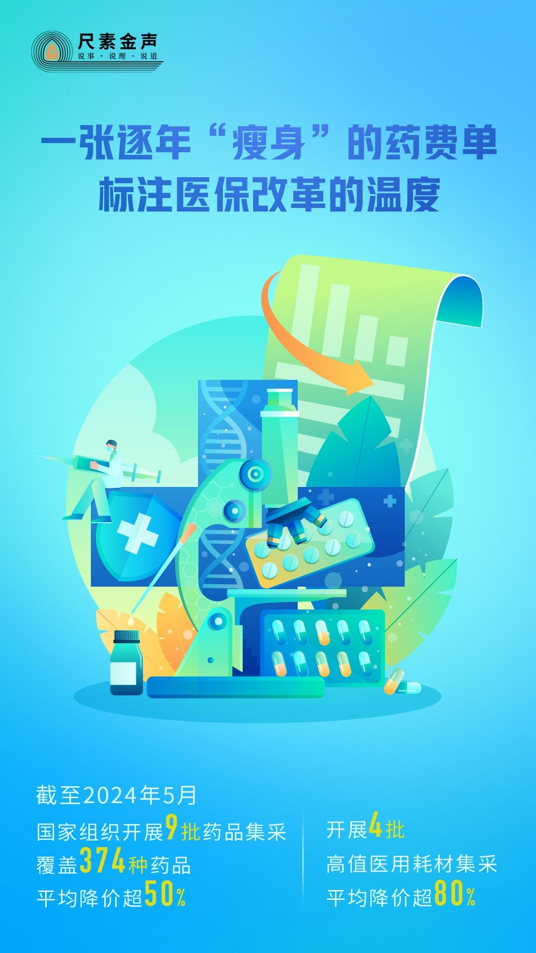 药品集采推动药品价格回归合理水平。减轻群众就医的药费负担,一直是党和政府高度重视的问题。2018年开始,国家组织药品集中采购和使用试点,有力推动药品价格回归合理水平。截至2024年5月,国家组织开展9批药品集采,覆盖374种药品,平均降价超50%,广泛涵盖糖尿病、高血压、心脏病、细菌感染等常见病慢性病用药;开展4批高值医用耗材集采,覆盖心脏支架、人工关节、骨科脊柱、人工晶体、运动医学等耗材类别,平均降价超80%,挤出了高价医用耗材的价格水分。药品集采从用药负担、用药质量、用药可及性以及治疗效果等方面,显著提升了群众的获得感。