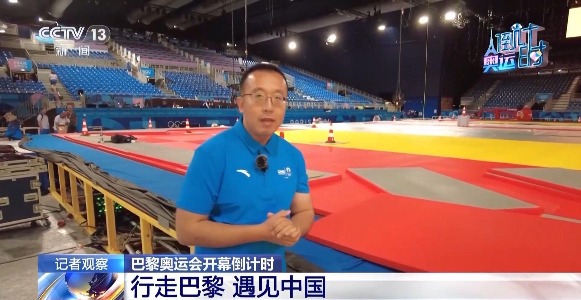 总台央视记者 黄达:此次亮相巴黎奥运赛场,除了上面所说的这些器材外,还有很多独具中国“智造”特色的装备。比如说,我们现在所在的柔道摔跤场馆,我们可以看到场地内的地垫,已经基本上铺设完成了。而这些地垫正是来自中国山东的一家企业。垫子表面看似平常,但是实际上已经涂了一层纳米级防污抗菌涂层,不仅可以让运动员滴落的汗水实现速干,同时还具有防菌的功效,此外,在垫子的内部还装有压力传感装置,使用者可以根据情况自行开启,为比赛和训练提供数据支持。