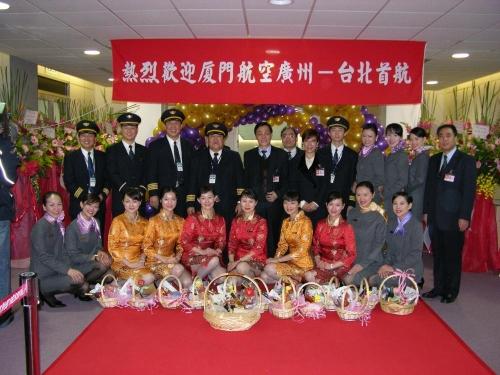 2005年,海峡两岸首次开放春节包机。这是2005年1月29日,厦航作为大陆6家参与台商春节包机直航的航空公司之一,圆满完成了广州-台北往返包机任务。这是厦航首航台北机组成员在台北与迎接人员亲切合影。
