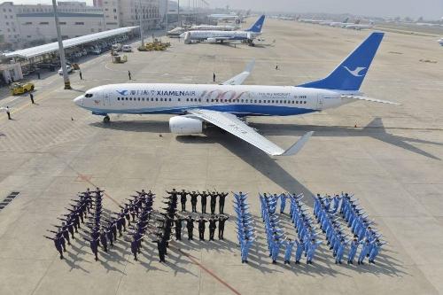 2013年11月16日,厦航机队规模增至100架,这是厦航员工在机队第100架飞机前摆出MF100字样。新华社记者 项开来 摄