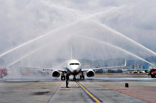 2008年,两岸“三通”启动常态包机,厦航成为厦门、福州和杭州航点的运营航空公司。这是2008年12月15日,台北松山机场以“水门”仪式迎接厦航常态化包机。