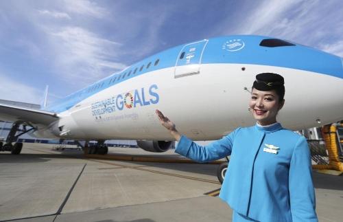 2018年1月26日,在美国查尔斯顿波音工厂,中国厦门航空公司的一名空乘人员展示厦航首架涂装宣传联合国可持续发展目标的客机。新华社记者 王迎 摄