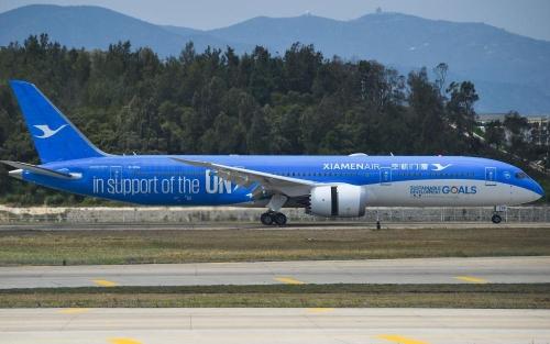 2018年3月21日,联合国特殊涂装飞机厦门航空“联合梦想号”正式在福建福州长乐国际机场亮相。新华社记者 宋为伟 摄