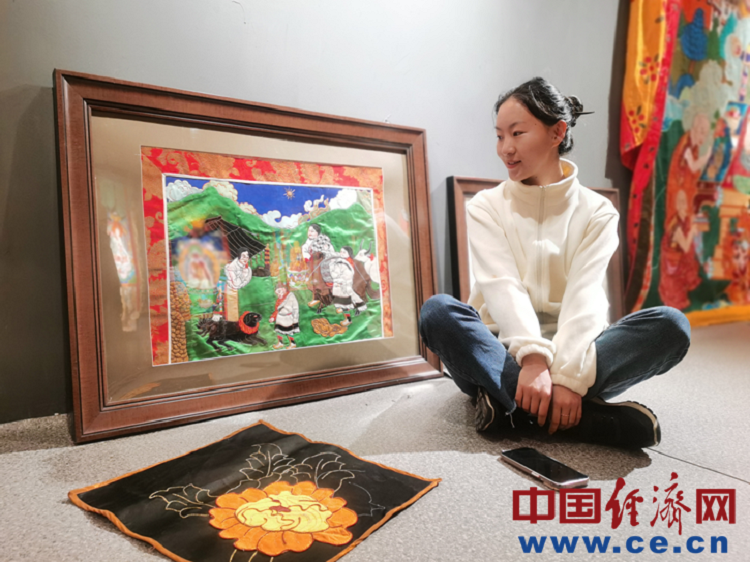 图为巴桑德吉和她的《羌塘牧区图》堆绣装饰画。 中国经济网记者 魏金金/摄
