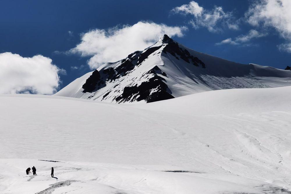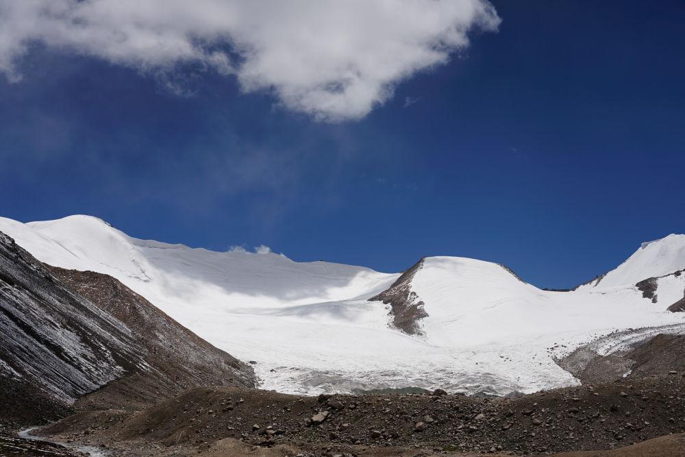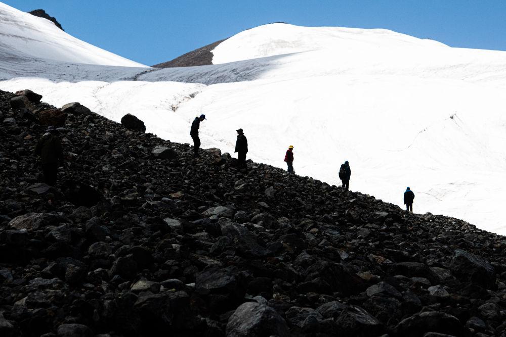 2022年7月28日,在格拉丹东雪山,来自长江科学院的科考队员走向探测点位。新华社记者 肖艺九 摄