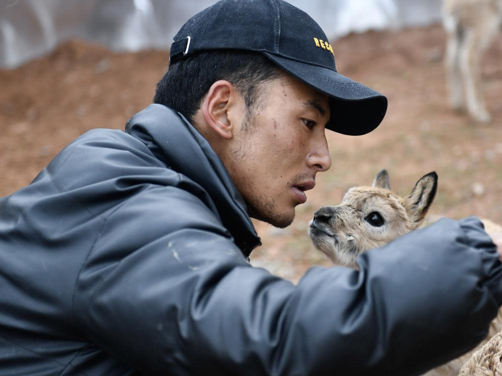 2020年7月7日,在可可西里卓乃湖保护站,保护队员才文多杰照顾一只藏羚羊幼仔。新华社记者 张龙 摄