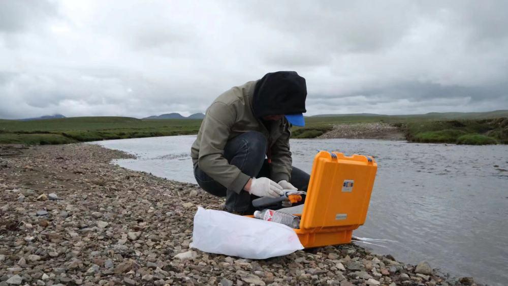 7月22日,长江科学院流域水环境研究所韩成在长江南源当曲采集河水样本。新华社记者 周喆 摄