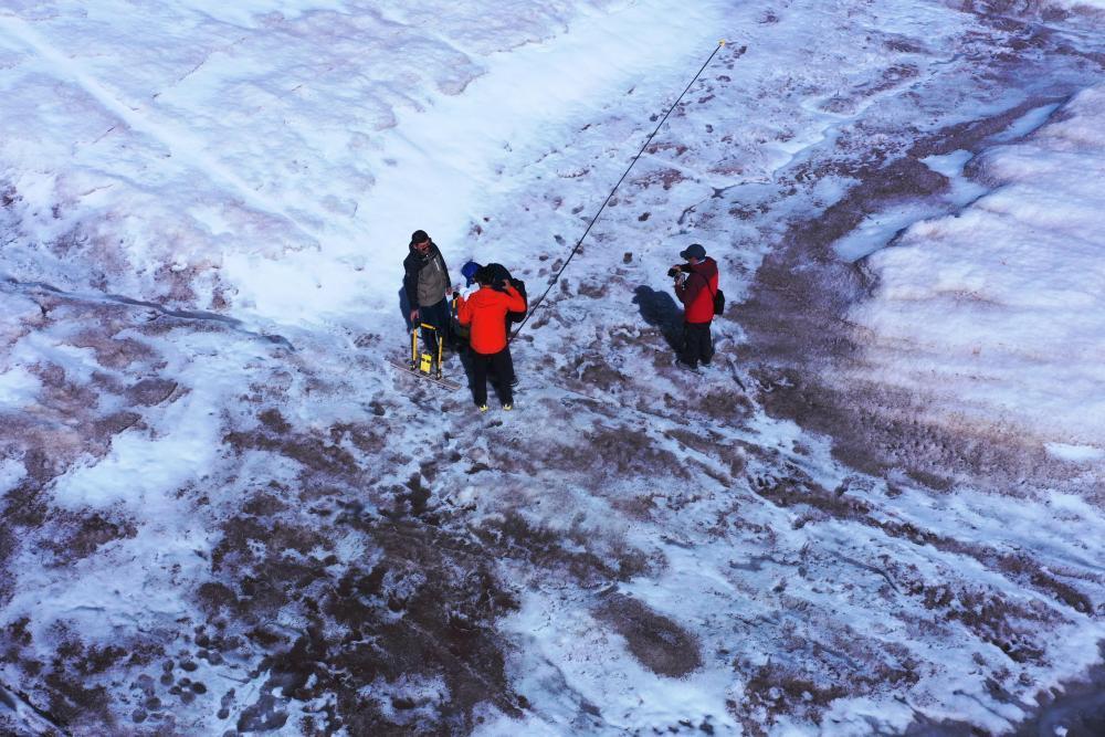 科考队员在冰面上使用地质雷达探测冬克玛底冰川厚度(2023年7月27日摄,无人机照片)。 新华社记者 陈杰 摄