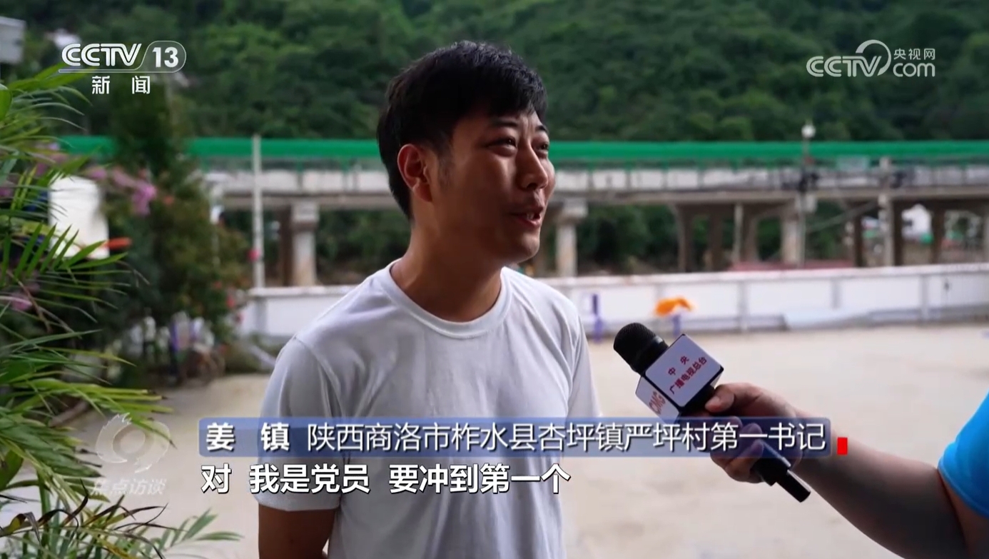 陕西商洛市柞水县杏坪镇严坪村第一书记姜镇:“当时那水都到这了,我第一个过去,然后我让他们都跟着我,沿着那个路走。”