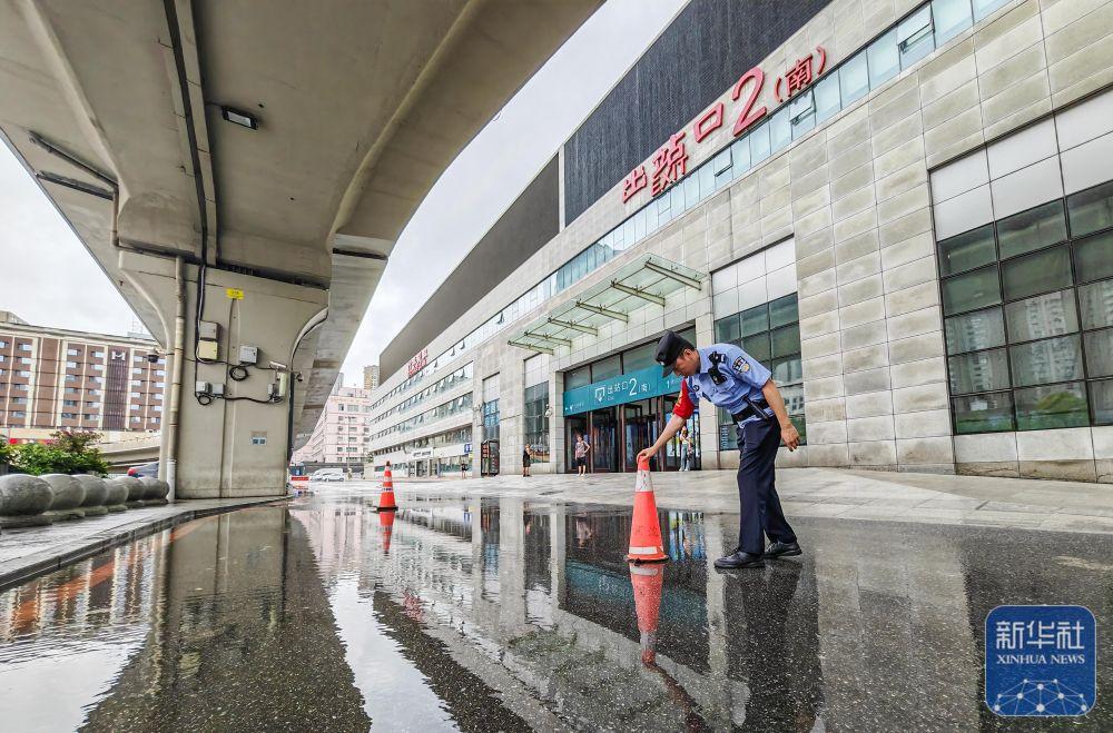 7月28日,在沈阳北站,沈阳铁路公安处民警在出站口附近的积水处设立警示标志。新华社发