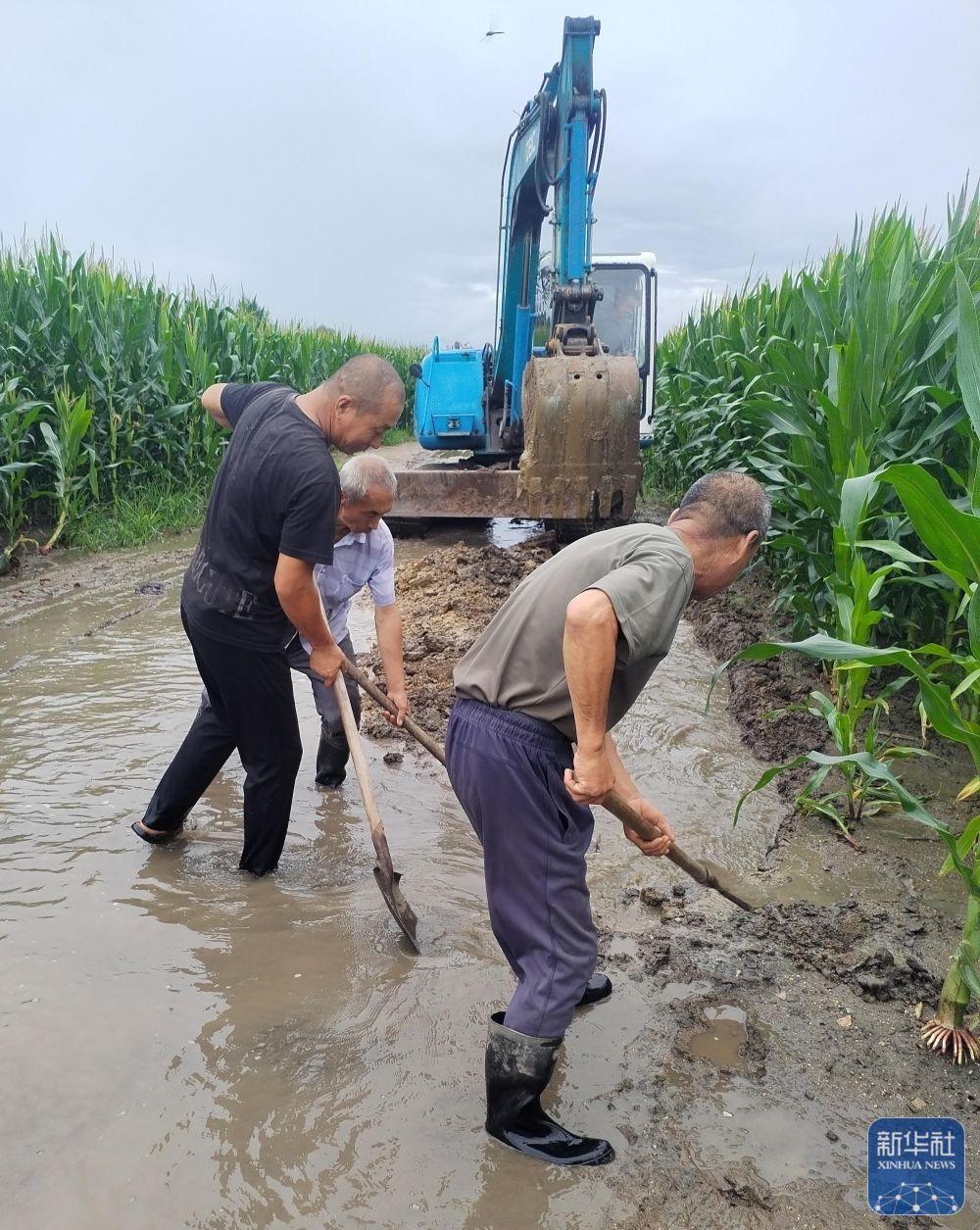7月28日,铁岭市昌图县昌图镇八家子村组织党员干部来到低洼耕地进行排水,减少农田内涝。新华社发