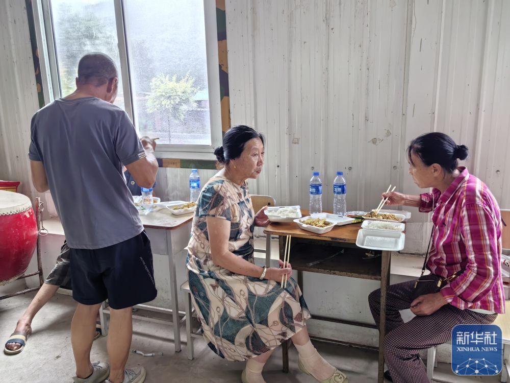 7月27日,在辽宁省铁岭县大甸子镇,受灾群众在安置点吃饭。新华社发