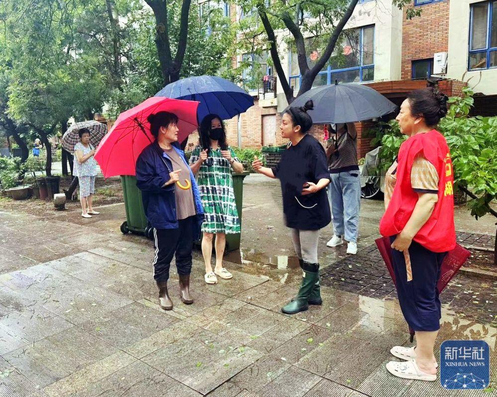 7月27日,营口市站前区建丰街道工作人员叮嘱居民注意安全。新华社发