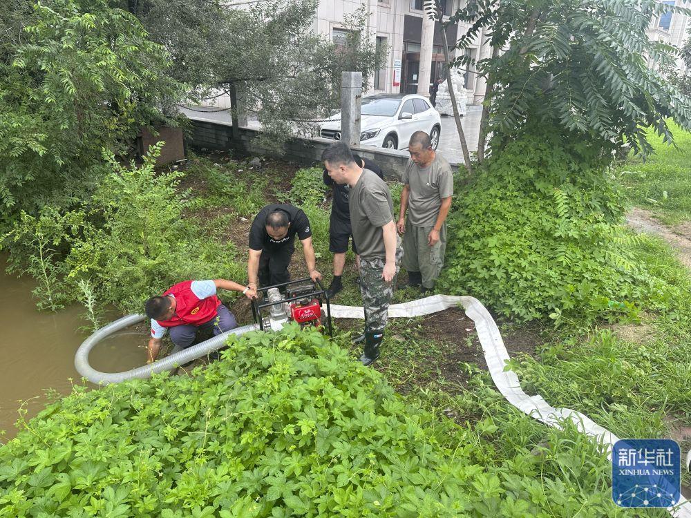 7月27日,在辽宁省鞍山市千山区汤岗子理疗医院,汤岗子街道工作人员在清理积水。新华社发