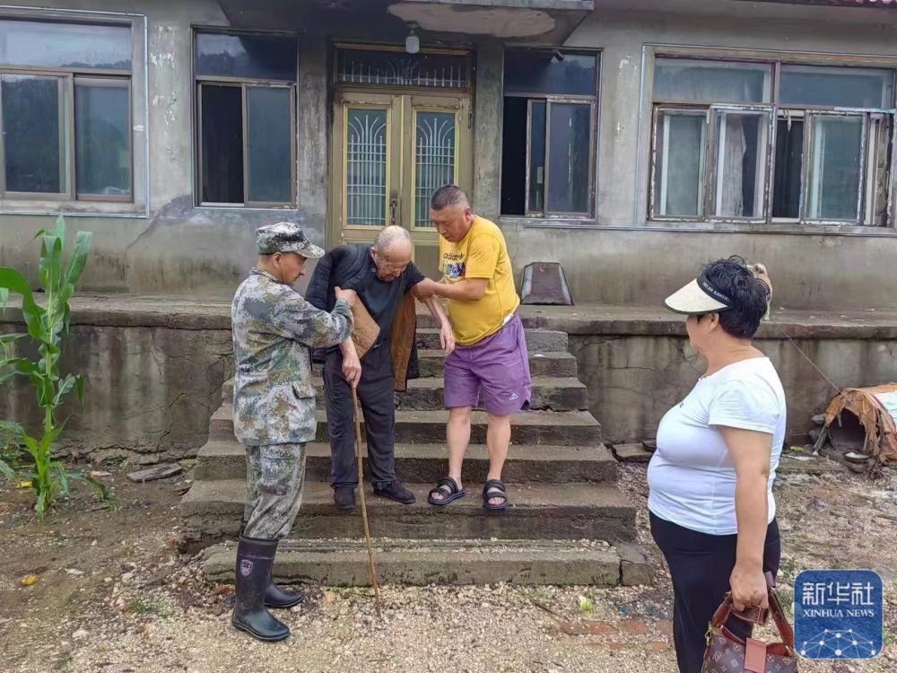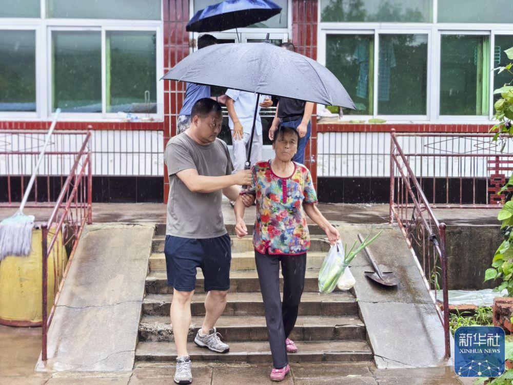 7月27日,在辽宁省铁岭县鸡冠山乡业尔兴村,村干部在转移受灾群众。新华社发