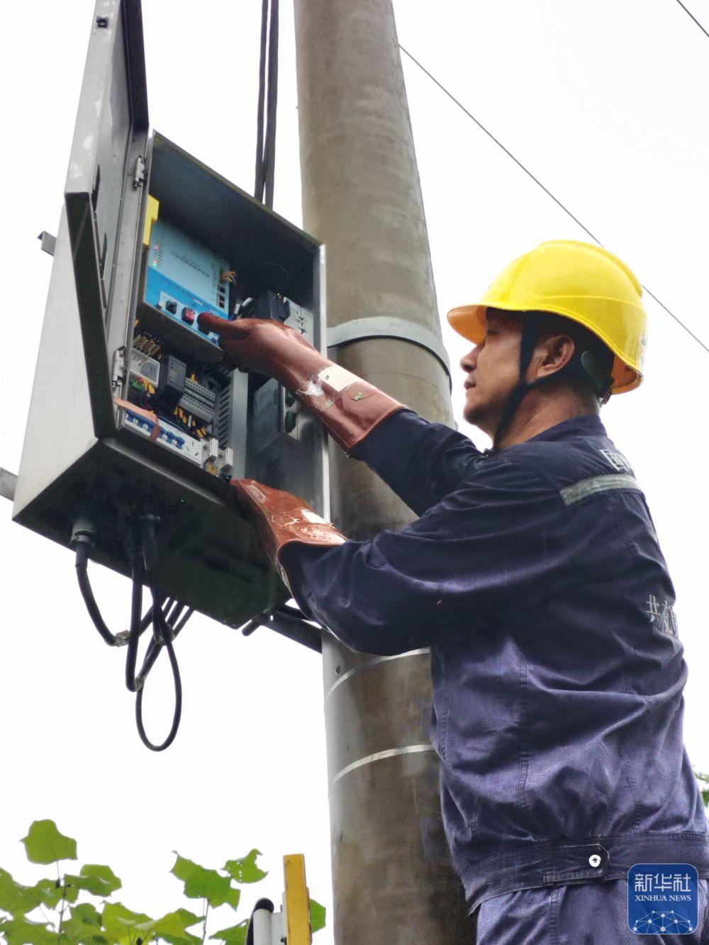 7月27日,在辽宁省丹东市,国家电网丹东供电公司员工对10千伏堡镇线进行检查。新华社发