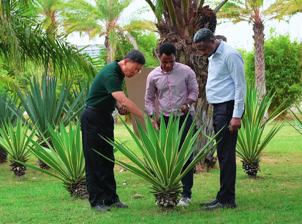 在三亚崖州湾科技城,非洲留学生跟随中国热带农业科学院研究员易克贤(左一)在观察剑麻育种材料长势(2024年5月17日摄)。黎多江摄/本刊