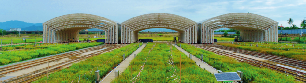 在位于三亚的国家耐盐碱水稻技术创新中心崖州湾总部科研试验基地,建设了高标准试验田、盐(碱)性精准鉴定盐池、自动防雨钢棚、水土盐碱度智能化监测系统等配套设施(2024年5月17日摄)。黎多江摄/本刊