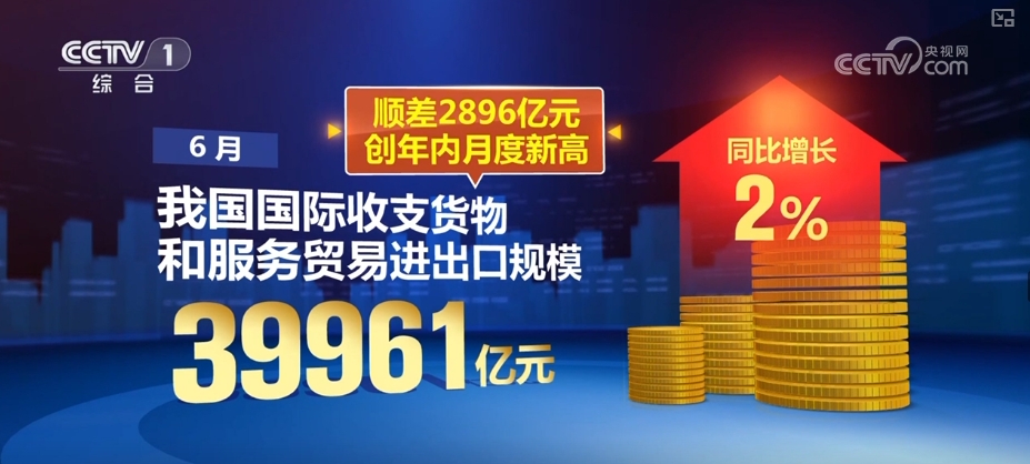 6月,我国国际收支货物和服务贸易进出口规模39961亿元,同比增长2%;顺差2896亿元,创年内月度新高。