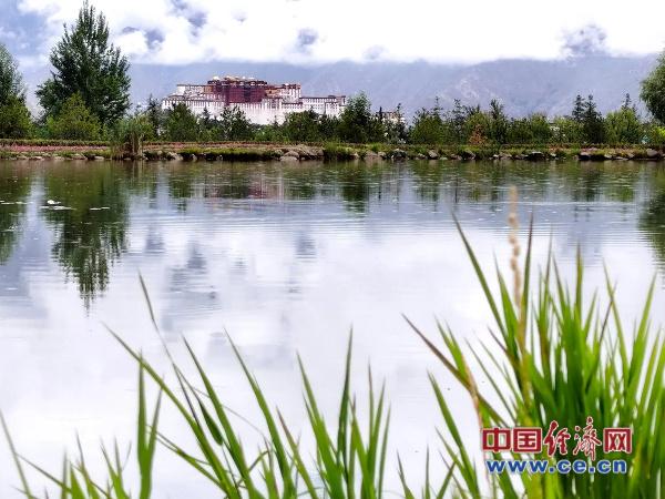 在“布宫镜湖”前远眺布达拉宫。中国经济网记者魏金金/摄